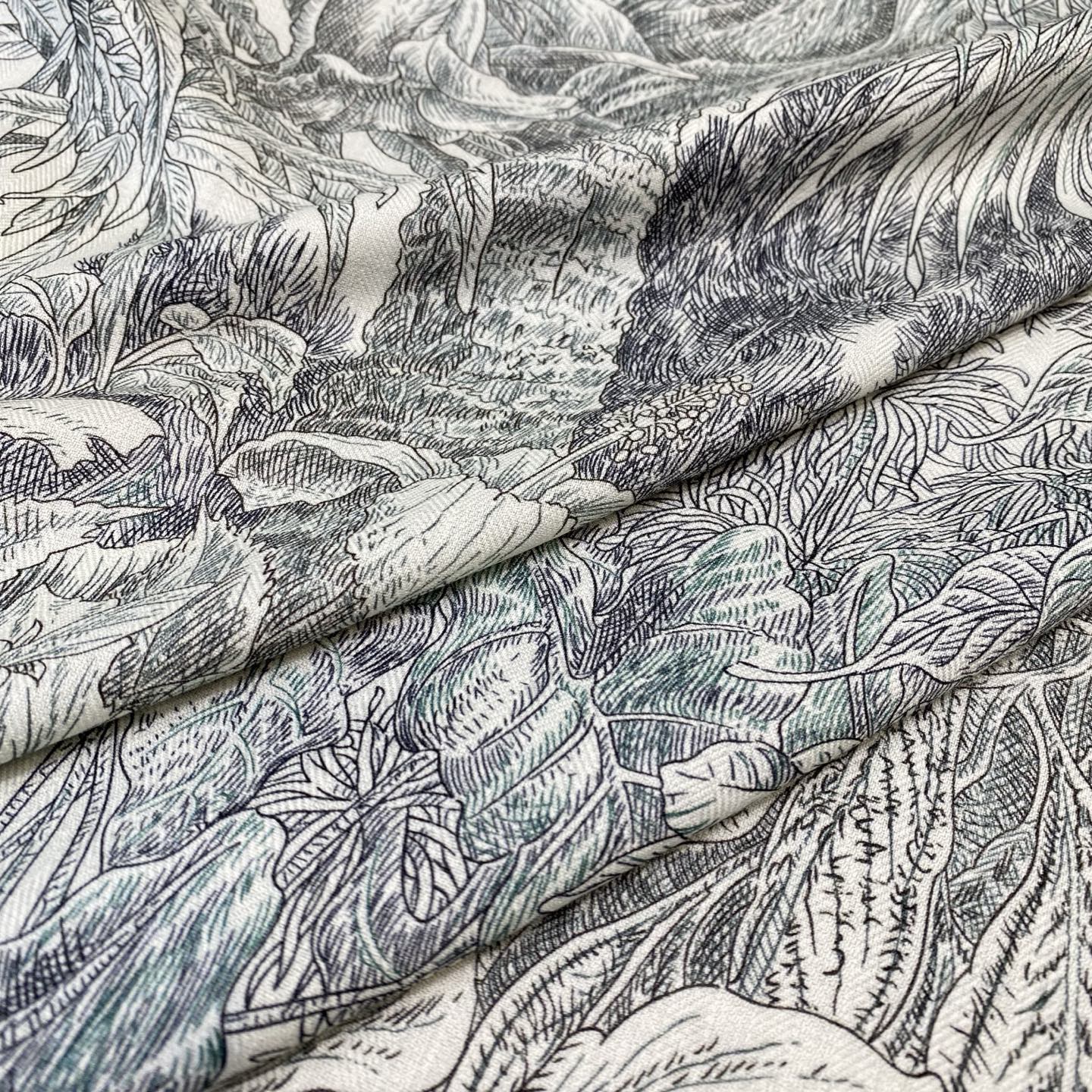 これは華やかで変化に富む庭園であり、イタリア風の絢爛な風景が広がる作品です:様々な地中海固有種と熱帯植物が共生し、繁茂した奇跡のような景観を構成しています。青々と茂るバンヤンの枝叶、ヤシの木、ソテツの隙間からは、18 世紀のロマンティックな建築の姿がかすかに窺えます。フランソワ・ウータン(François Houtin)はこのパレルモ植物園に足を踏み入れ、神秘的なバロック様式の緑の殿堂の中で長時間彷徨い、目にした美しい風景を華やかで優雅なスカーフのデザインへと昇華させました。