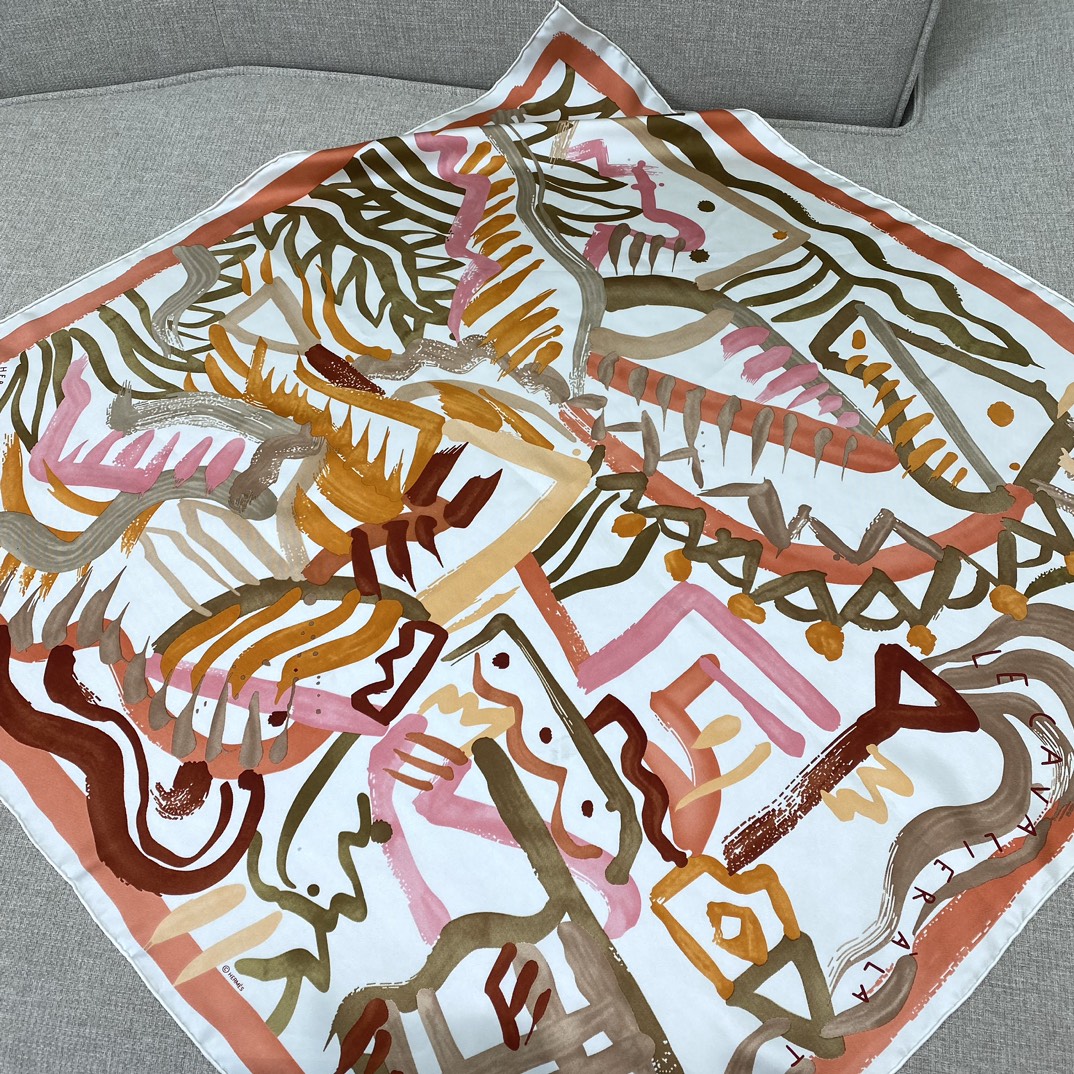 オリジナルスペックの生地を使用!精緻な手作業による縁かがりを施し、配色は高級感あふれるデザインで❤️デザイン内容が鮮明、ラインの存在感も強い特徴を持ちます!デザインのインスピレーションは、中世の写本(マニュスクリプト)、愛と戦争をテーマにした叙情詩の手稿(手書き原稿)、さらに 1960 年代に世界的に評価の高かったポーランドのポスターから得られています。21 世紀の「騎士詩人」として、デザイナーは太く、まるで子供のような天真烂漫な筆致で輪郭を描き、このスカーフに明るく陽気な雰囲気を添えています。商品仕様
