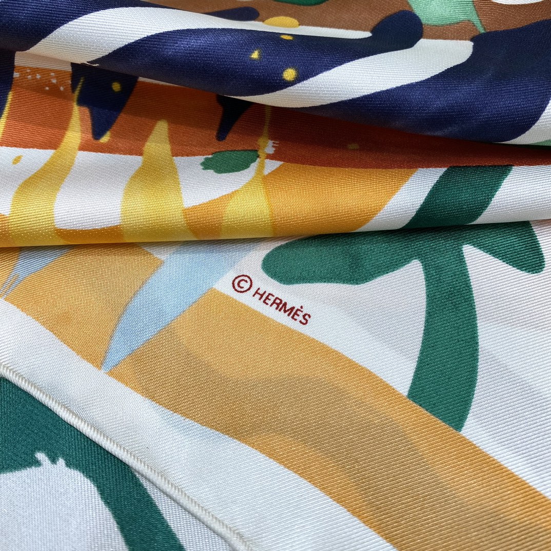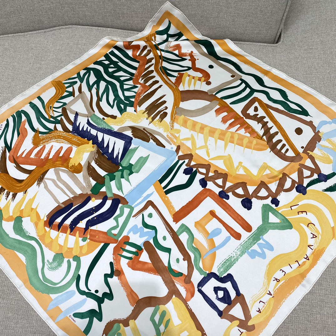 オリジナルスペックの生地を使用!精緻な手作業による縁かがりを施し、配色は高級感あふれるデザインで❤️デザイン内容が鮮明、ラインの存在感も強い特徴を持ちます!デザインのインスピレーションは、中世の写本(マニュスクリプト)、愛と戦争をテーマにした叙情詩の手稿(手書き原稿)、さらに 1960 年代に世界的に評価の高かったポーランドのポスターから得られています。21 世紀の「騎士詩人」として、デザイナーは太く、まるで子供のような天真烂漫な筆致で輪郭を描き、このスカーフに明るく陽気な雰囲気を添えています。商品仕様