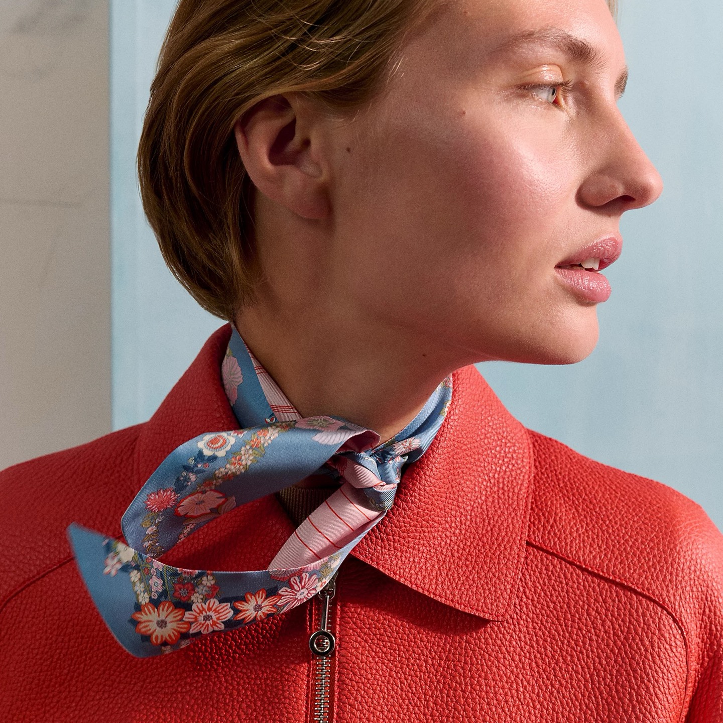 「華やかな手綱フラワーバージョン」スカーフのデザインからインスピレーションを受けて制作された本スカーフは、「華やかな手綱」の原柄を再構想し、フラワー(花卉)とフルーツ(水果)で原版デザインのラインを描き出しています。クリスティーヌ・アンリー(Christine Henry)とユーゴー・グリガール(Hugo Grygkar)の創造的な才がここで融合しています。ワスレナグサ(勿忘我)、ハイビスカス(木槿花)、フヨウ(芙蓉花)と、ブルーベリー(蓝莓)、イチジクの木(无花果树)が交互に組み合わさり、心を打つ田園交響曲を奏でています。馬術用のバックルストラップ(马术扣带)と手綱(鞍辔)はまるで芳香を放つ花や果物の香りを漂わせ、華やかな色彩で春の訪れを迎え、詩情あふれる大自然の景色を美しく表現しています。商品仕様